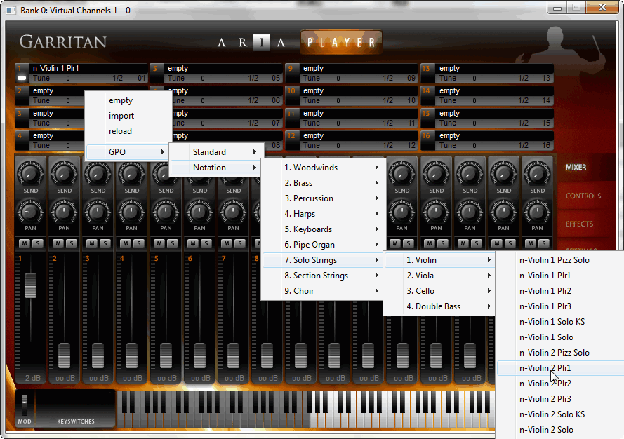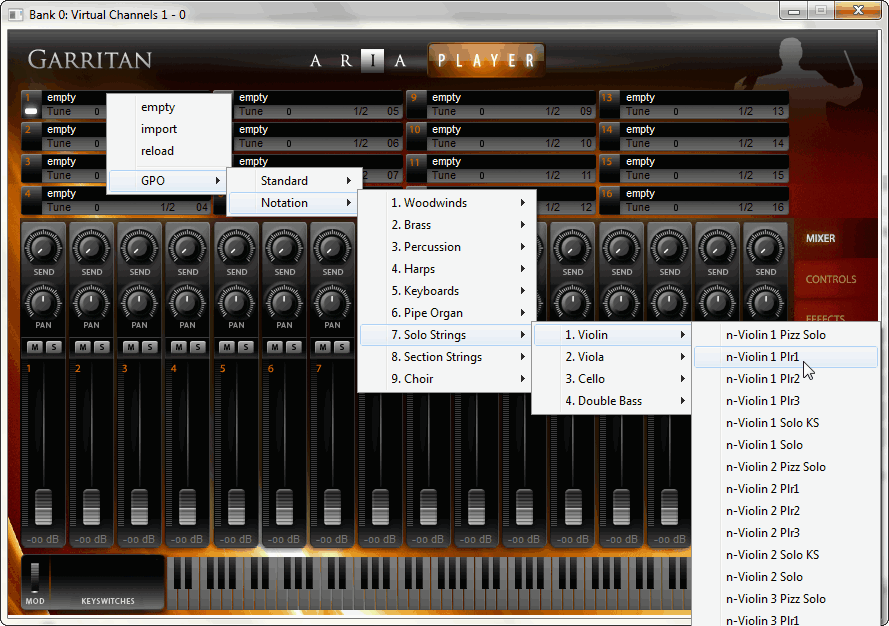 - Cliccate sulla parola "empty" nel primo slot, quindi, navigando tra i vari sottomenu, cercate lo strumento che volete caricare. In questo caso scegliete: GPO > Notation > Solo Strings > Violin > n-Violin Plr1.