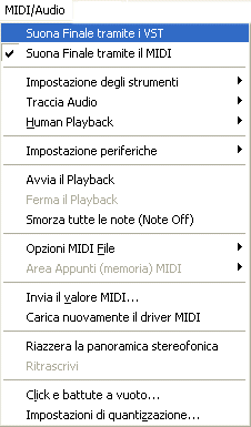 Dovete farlo anche per tutti i file per i quali non intendete utilizzare i suoni della GPO durante l’inserimento della musica. Una volta terminata la creazione del documento con l’Impostazione guidata del documento, dal menu MIDI/Audio di Finale, dovete deselezionare l’opzione Suona Finale tramite i VST/AU: