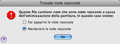 Questa finestra di dialogo vi permette di scegliere come trattare le note nascoste nei righi ottimizzati, offrendovi la possibilità di lasciarle nascoste oppure di renderle visibili.