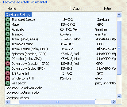 Ogni voce dell'elenco rappresenta una specifica tecnica o effetto. L'elenco di tecniche riportato nell'immagine qui sopra non è che il set predefinito, che comprende 30 voci, incluse le tecniche e gli effetti per gli strumenti SoftSynth, Finale GPO, Garritan Personal Orchestra (versione integrale), Garritan Jazz & Big Band, Marching Band, Violini Stradivari e Violoncelli Gofriller.