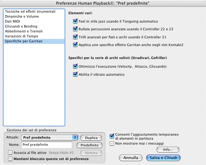 Finestra di dialogo Preferenze di Human Playback - Specifiche per Garritan