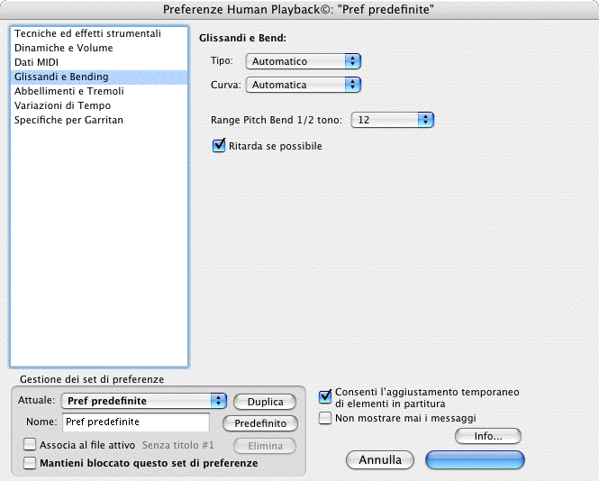 Finestra di dialogo Preferenze di Human Playback - Glissandi e Bending