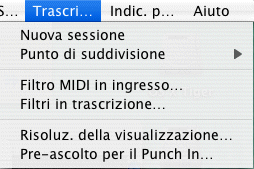 Una volta registrata un’esecuzione in tempo reale nella finestra Trascrizione, Finale ha bisogno di alcune informazioni, prima di cominciare a trascrivere. In questo menu è possibile dire al programma se e come volete che l’esecuzione sia trascritta in due righi; che livello di quantizzazione debba essere applicato; che ventaglio di note volete includere o escludere dalla trascrizione; se sono presenti voci interne e così via.