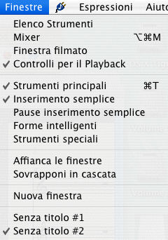 Il menu Finestre controlla (e indica) quali finestre sono aperte e quali sono in primo piano (attive). Ha inoltre comandi per affiancare o sovrappore, per sistemare automaticamente finestre multiple onde ottenere una più conveniente visualizzazione convenient layout.