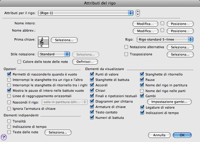 “Indipendenti” significa che questi elementi possono essere impostati diversamente per ogni rigo della partitura. Queste opzioni vi permettono di specificare le indicazioni di chiave, di tempo, il font musicale o la forma delle teste delle note in modo indipendentemente per ogni rigo.