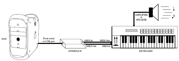 L’ultimo oggetto, l’interfaccia MIDI, è un dispositivo che trasforma i segnali in arrivo dalla tastiera MIDI in segnali comprensibili al computer e viceversa. Le interfacce possono essere molto semplici o molto elaborate. Quelle di base non richiedono alimentazione esterna e hanno l’ ingresso per una sola tastiera, mentre a quelle più elaborate possono essere collegate più tastiere. Molti MAC sono dotati di porte USB (Universal Serial Bus), un tipo di connessione standard che permette agli utenti di connettere periferiche al proprio computer senza doverlo riavviare perché vengano riconosciute.