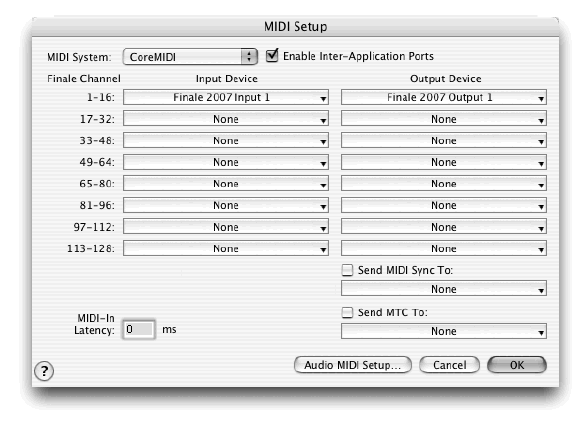 La finestra Impostazioni MIDI è il luogo preposto per istruire Finale su quali dispositivi usare per gestire le funzioni MIDI. Sulla parte destra della finestra di dialogo, sotto Periferiche in ingresso, è possibile selezionare le periferiche in ingresso presenti nel vostro computer. Con questa scelta potete decidere a quali periferiche desiderate affidare la riproduzione della vostra musica.