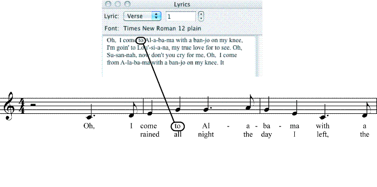 Suggerimento: se volete controllare velocemente le note alle quali state attaccando le sillabe del testo cantato ascoltandole via MIDI, tenete premuto il tasto option e la Barra Spaziatrice e trascinate il cursore del mouse attraverso il pentagramma. Finale farà suonare ogni nota toccata dal cursore, a prescindere dalla direzione di trascinamento.