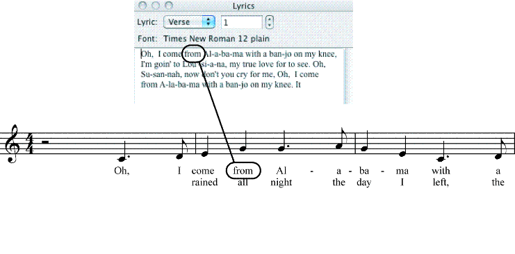 Notate che le sillabe inserite in partitura compaiono automaticamente nella finestra del Testo cantato. Potete, in seguito, utilizzare questa finestra per cambiare carattere, stile o dimensione del testo cantato. Inoltre, una volta che il testo cantato è scritto nella finestra del Testo cantato, può essere inserito in partitura mediante il metodo di Assegnazione con il click (si veda Inserire il testo cantato in partitura (assegnazione conil click).