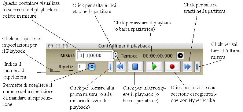 I Controlli per il Playback si trovano su di una finestra spostabile. Questi sono in grado di darvi dei controlli addizionali sulla modalità di riproduzione della partitura—per esempio, si trovano i pulsanti Play (suona), Stop (ferma), Rewind (ritorna indietro) e Fast Forward (avanti veloce). Vi permettono inoltre di ascoltare partendo da qualunque punto della partitura, anche se quest’ultima non è presente sullo schermo.