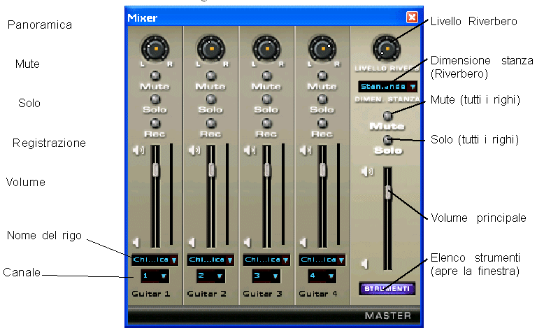 - Dal menu Finestre scegliete Mixer. Apparirà l’interfaccia del mixer, con i moduli di controllo separati per ciascun rigo e un modulo di controllo master. Potete anche visualizzare i moduli di controllo relativi ai righi nell’interfaccia Controlli del rigo, alla sinistra della partitura, se scegliete Visualizzazione Studio dal menu Visualizzazione. Gli stessi controlli (ai quali vengono aggiunti controlli individuali per i singoli livelli e per gli accordi) sono inoltre disponibili nella finestra Elenco degli strumenti (scegliete Elenco degli strumenti dal menu Finestre).