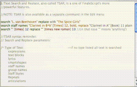 - [Finestra dell’editor]. Utilizzate questa finestra per stabilire i comandi di Finale che dovranno essere applicati quando avvierete lo script. Le scorciatoie i sistemi di codificazione per i comandi e gli script di Finale potete troivarli nell’Appendice. Si veda FinaleScript Plug-in. Il comando // per inserire commenti che non saranno interpretati come parti influenti del processo. Utilizzate /* <multi-line comment> */ per inserire un commento che occupi più di una linea.