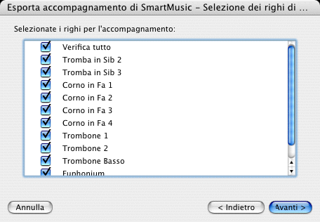 - Selezionate l'opzione Ensemble, quindi cliccate su Avanti. Si aprirà la pagina Selezione dei righi di accompagnamento della finestra di dialogo.