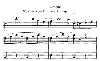 Per assegnare manualmente i marker necessari con lo Strumento Espressione, inserite un marker Attendi inizio nota alla fine del passaggio e i marker di Ripresa e Riazzera il tempo sulla nota in corrispondenza della quale l’accompagnamento deve essere ripreso. Quando il solista suonerà la nota alla quale avete assegnato il marker di ripresa, l’accompagnamento ricomincerà a suonare. Questo è particolarmente utile quando un’indicazione a tempo segue un passaggio con effetto di ritardato o di rallentando.