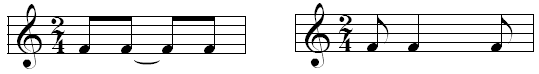 Sinistra: sincope scritta utilizzando la legatura di valore. Destra: notazione “abbreviata” (morbida) della sincope.