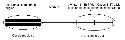 Le battute selezionate debbono ora essere copiate alla fine del brano. Ma non possiamo ovviamente trascinare le battute selezionate sino alla destinazione, dato che questa non è visibile sullo schermo. Useremo invece un’altra “scorciatoia”, che funziona come segue: