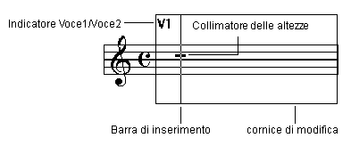 Se l’opzione Apri automaticamente la cornice di editing è selezionata, vedrete la prima battuta contornarsi di una cornice rettangolare, sul lato sinistro della quale compare un sottile cursore verticale, detto barra di inserimento. Oltre a questo compare un corto cursore orizzontale, detto collimatore delle altezze, che useremo per indicare le altezze delle varie note.