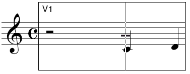 Nell’angolo superiore sinistro compare un piccolo “V1” a significare che Finale è pronto a ricevere la Voce 1 (se voleste creare più voci, con le gambe delle note coerentemente verso l’alto o il basso, Finale le chiamerebbe Voce 1 e Voce 2. In ogni caso, è più conveniente utilizzare i quattro livelli trasparenti di Finale.