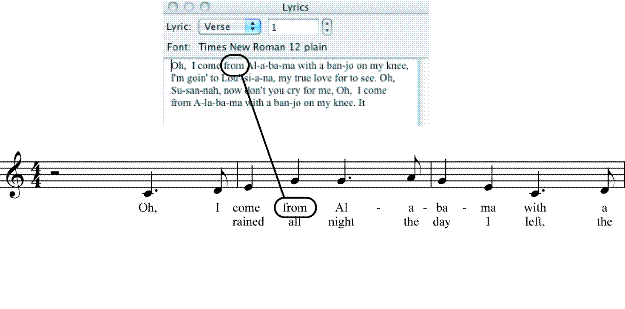 Quando scrivete il testo cantato con la modalità Digita in partitura, in pratica inserite il testo nella finestra Modifica del testo ed allo stesso tempo assegnate le sillabe alle note. Quando si utilizza lo Strumento Selezione per cancellare il testo cantato, si cancella soltanto l'assegnazione del testo alle note, ma le parole rimangono nella finestra di dialogo Modifica del testo, disponibili per essere riassegnate ad altra musica in un secondo tempo. Si possono anche assegnare le stesse sillabe, lo stesso testo, a più linee melodiche. Funzione, questa, che ci permette, ad esempio, di non dover riscrivere la parola "Alleluyah" 20 volte!