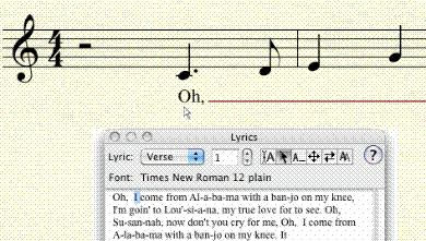 - Posizionate il puntatore del mouse sul rigo nella posizione della prima nota della melodia. Cliccate una prima volta. La prima sillaba, “Oh,” salterà fuori dalla finestra di Assegnazione con il click e si incollerà alla prima nota.