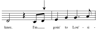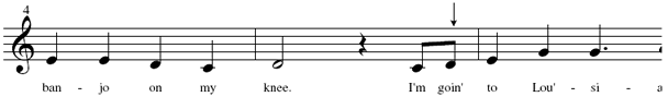 Scorrete il vostro Foglio guida e controllate l’operazione appena conclusasi. Probabilmente noterete un problema: a cominciare da battuta 5 il testo “I’m goin’ to Lou’-si-a-na” non è stato assegnato correttamente alle note.