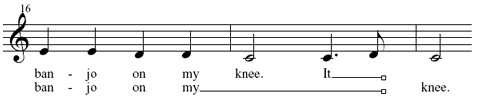 "I", [sillaba invisibile], poi: "come from Al-a-ba-ma with a ban-jo on my" [sillaba invisibile] [sillaba invisibile] [sillaba invisibile], poi: "knee".
