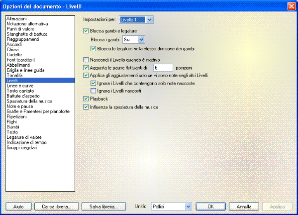 Finale permette la creazione di un numero massimo di voices (voci) polifonicamente indipendenti, per ogni rigo. (In ogni voce, un accordo può avere sino a 12 note, il che dà un totale di 96 voci per ogni rigo). Nella maggior parte dei casi saranno sufficienti, con tutta probabilità, due voci: una con i gambi in su e l’altra con i gambi in giù. Questo tipo di notazione è particolarmente agevole in Finale perché ogni rigo può disporre di quattro strati completamente indipendenti di note. Possiamo pensarli come fogli trasparenti sui quali scrivere le note, ognuno indipendente dall’altro. Il passaggio dall’uno all’altro dei Livelli è molto semplice, ed è possibile di volta in volta “nascondere” gli “strati” su cui non si sta lavorando.