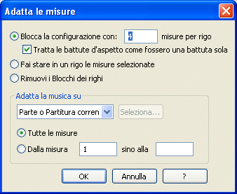 Con i comandi di Adatta le misure la configurazione della musica (ossia il suo aspetto a livello di impaginazione) dipende dal vostro giudizio. Ricordate che Finale scrive automaticamente la vostra musica usando il massimo numero possibile di battute per riga. Potrete sempre scavalcare le decisioni del programma, ma il risultato potrebbe non essere soddisfacente.