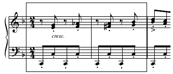 Le due battute sono selezionate. La selezione della musica con lo Strumento MIDI funziona esattamente nello stesso modo in cui funziona la selezione con lo Strumento Selezione (se l’opzione Seleziona parzialmente le misure è disattivata). Si seleziona una singola battuta cliccandola una sola volta; si selezionano più battute catturandole con il mouse; si seleziona un’ampia zona della partitura cliccandone la prima battuta, indi scorrendo all’ultima battuta da selezionare ed effettuando uno -click su di essa. Si seleziona il contenuto di un intero pentagramma cliccando a sinistra del pentagramma stesso. Infine, si seleziona un intero brano attivando l’opzione Seleziona tutto del menu Modifica.