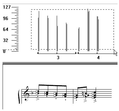 In basso, nella finestra, vedrete le note contenute nelle battute sulle quali avete eseguito un doppio click. Sopra di esse compare un grafico. Ogni barra del grafico corrisponde alla Key Velocity della nota posta immediatamente al di sotto. Sul lato sinistro della finestra appare una scala da 0 a 127 dei valori di Velocity.