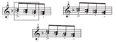 Alcune annotazioni sulle rimanenti opzioni del menu Strumento MIDI. Le descrizioni assumeranno che abbiate preventivamente selezionati gli eventi che desiderate modificare. Ricordate che, quando non vi trovate nella finestra MIDI, la selezione delle battute avviene esattamente come per lo Strumento Selezione. Nella finestra MIDI le note possono essere selezionate “catturandole” o cliccando le loro maniglie. All’interno della finestra MIDI è possibile editare un rigo singolo e potete selezionare le note sia trascinando con il mouse nella parte grafica della finestra, sia selezionando le maniglie delle singole note come viene qui di seguito mostrato:
