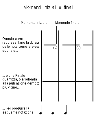 Questi termini sembrano facili a comprendersi: Momento iniziale si riferisce all’attacco della nota, mentre Momento finale fa riferimento al rilascio del tasto, ovvero al termine della nota. Ciò che rende leggermente complicate queste informazioni è il fatto che esse non si riferiscono alle durate riportate in notazione, ma pongono in relazione i valori notazionali con i “dati MIDI catturati” registrati durante l’esecuzione originale nella finestra dello Strumento Trascrizione, prima che detta esecuzione fosse quantizzata e trasformata in notazione.