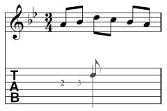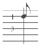 - Premete il tasto 3 sul tastierino numerico. Il secondo numero di tasto si trasfoermerà in un 3. Potete utilizzare questa procedura per terminare di scrivere la vostra intavolatura: selezionate la durata ritmica, cliccate sulla corda e digitare il numero di tasto che volete inserire. Potete anche inserire la musica nel rigo di intavolatura senza l'uso del mouse, utilizzando invece l'Indicatore di inserimento semplice.