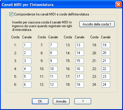 I dati MIDI generati da ciascuna corda della chitarra MIDI raggiungono Finale su canali MIDI differenti. Per poter organizzare in modo corretto queste informazioni, dovete comunicare a Finale quali sono i canali assegnati a ciascuna corda. In questa finestra inserite il canale di ciascuna corda così come è stato impostato sulla vostra interfaccia MIDI per chitarra. Consultate in proposito la documentazione dell’interfaccia.