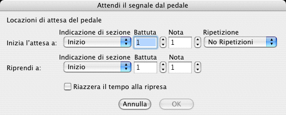 - Inizia l’attesa a: Indicatore di sezione • battuta • Nota • Ripetizione. Scegliete un indicatore di sezione, una ripetizione o specificate la misura e la nota sulla quale volete aggiungere un marker di tipo Attendi il pedale.