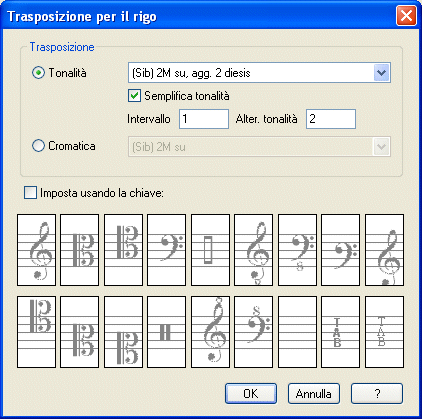 - Cliccate sulla casella trasposizione e cliccate su Seleziona. Apparirà la finestra Trasposizione per il rigo all’interno della quale potete impostare il tipo di trasposizione deesiderato. Per gli strumenti più comuni, come appunto il clarinetto, esistono già delle impostazioni predefinite.