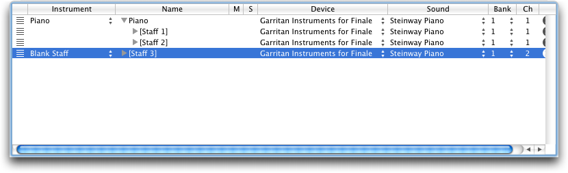 Un'accollatura per pianoforte di 3 righi è composta di tre righi raggruppati in un'unica accollatura con una sola parentesi. Nel databse di strumenti di Finale non esiste un'accollatura predefinita di questo tipo, ma potete crearla facilmente, seguendo una semplice procedura.