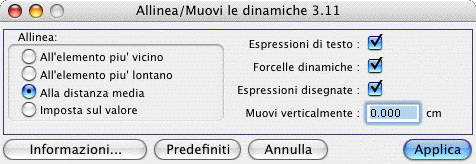 All'elemento più vicino· All'elemento più lontano· Alla distanza media· Imposta sul valore. Scegliete All’elemento più vicino per allineare tutte le espressioni di dinamica all’elemento più vicino al rigo. Scegliete All’elemento più lontano per allineare tutte le espressioni di dinamica all’elemento più lontano dal rigo. Scegliete Alla distanza media per allineare tutte le espressioni di dinamica ad una distanza media dal rigo. Selezionate Imposta sul valore per spostare tutte le dinamiche selezionate alla distanza specificata nel campo “Muovi verticalmente” a partire dalla linea inferiore del rigo. Quando Imposta sul valore non è selezionato il valore specificato viene aggiunto alla distanza. Cliccando ripetutamente su Applica potete spostare i segni di dinamica.