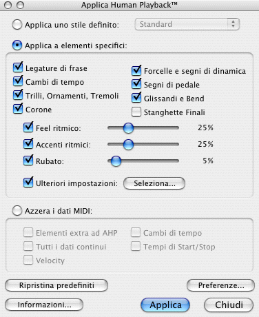- Applica a elementi specifici · Seleziona. Selezionate questa casella di controllo e poi gli elementi che volete vengano interpretati da Human Playback. Cliccate sul pulsante Seleziona per accedere alla finestra di dialogo Ulteriori impostazioni.