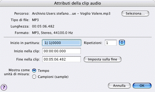 Seleziona. Qui viene descritto il percorso di collocazione del file audio inserito nella traccia. Cliccate su Seleziona per poter spostare il file e modificare il percorso. Si tratta di un’opzione importante, perché se dovete spostare il documento di Finale (la vostra partitura) su un altro computer, il percorso del file audio dovrà essere aggiornato, altrimenti nel momento in cui aprirete il documento Finale non potrà caricare il file audio, in quanto andrà a cercarlo nella collocazione qui specificata, senza trovarlo.