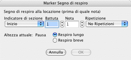 Dal menu Documento scegliete Aggiungi Marker di SmartMusic. Nella parte sinistra della finestra di dialogo che apparirà (un elenco delle varie tipologie di markers disponibili) selezionate Segno di respiro e cliccate su Aggiungi. Nel caso abbiate già inserito in precedenza un marker di questo tipo, selezionatelo nella parte centrale della finestra di dialogo e cliccate su Modifica. In entrambi i casi apparirà la finestra di dialogo Segno di respiro.