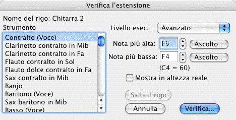 Ci sono tre estensioni predefinite per ciascun strumento riconosciute dal plug-in Verifica l’estensione: principiante, intermedio e avanzato. Se le estensioni predefinite non vi soddisfano potete specificare altri valori per le estensioni estreme (la nota più acuta e la più grave) dell’estensione che volete usare con il plug-in Verifica l’estensione.