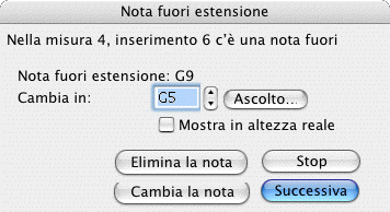 - Nota fuori estensione. Se una nota è troppo acuta o troppo grave per l’estensione specificata Finale farà scorrere la misura e il rigo su cui si trova la nota che disturba e vi presenterà una finestra in cui potete modificarne l’altezza.