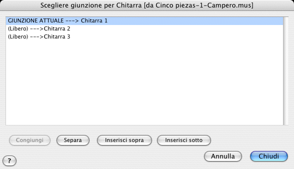 - Separa. Scegliete Separa per cancellare l’assegnazione attuale e specificare se volete operare un’associazione diversa oppure collocare lo strumento sul quale state lavorando sopra o sotto un altro rigo, oppure escluderlo del tutto dalla riunione dei file (in questo caso, quando tornerete alla finestra di dialogo Giunzione strumento per [nome del file], accanto allo strumento in questione, nella colonna a destra dell’area di visualizzazione, apparirà la scritta (NON SARA’ RIUNITO).