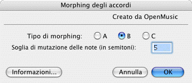 - Soglia di mutazione delle note (in semitoni). Usate questo comando per definire quanto debbano essere vicine le note perché la mutazione possa avvenire. La mutazione avviene solamente quando le note dell’accordo sorgente sono sufficientemente vicine a quelle di destinazione.