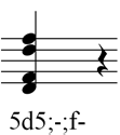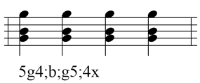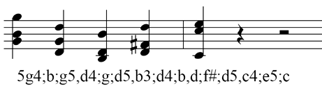 Questo è un esempio che inserisce cinque accordi nel rigo. Notate che la durata o l’ottava non deve essere più ripetuta sino a quando non si verifichi un cambiamento. Il punto e virgola designa le differenti note dell’accordo, mentre la virgola indica la nuova pulsazione.