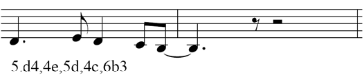 Nell’esempio precedente si utilizza il punto per indicare una nota puntata. Notate che per inserire una legatura a cavallo di battuta è sufficiente immettere la durata appropriata.