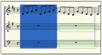 Quando si copia per trascinamento, Finale visualizza un bordo verde (figura a sinistra) intorno alla regione di destinazione se questa è adatta ad operare l’Incolla con un blocco di misure verticale. Se la regione di destinazione non è adatta a questo tipo di operazione, Finale visualizza un bordo nero (figura a destra). In questo caso, al rilascio del pulsante del mouse, la musica verrà inserita normalmente, senza copiare i dati specifici delle misure.