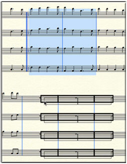 Un blocco di misure verticale può essere copiato utilizzando gli appunti o per trascinamento e incollato sulla regione di destinazione, sostituendo la musica già esistente, oppure inserito all'interno della musica, senza sostituirla (il che costituisce la differenza fondamentale tra "incollare" e "inserire". Nella copiatura di un blocco di misure verticale sono comprese le impostazioni relative alle misure, quali l'armatura di chiave, l'ampiezza della misura e lo stile delle stanghette di battuta. Si veda la finestra di dialogo Filtro nelle operazioni di modifica per maggiori dettagli.