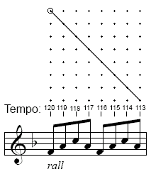 Supponete, quindi, di aver creato una forma di rallentando nello Strumento Disegno simile a quella raffigurata qui sotto. Quando inserirete la parola "rall." nello spartito (di cui questa Forma eseguibile è la definizione di playback), difficilmente sentirete qualche cambio di tempo nel playback. Basandovi su quello che sapete ora, vi accorgerete che questo succede perché la vostra linea scende solo di due linee della griglia in tutta la sua durata. Questo significa che il vostro rallentando cambia il tempo da 120 a 118 battiti al minuto!